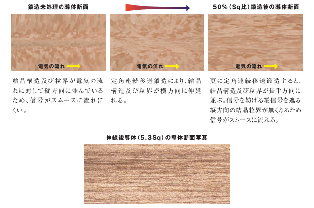 何でも、高純度OFC(無酸素銅)を適度な強さで叩く事で結晶がミルフィーユ構造になり、電気が流れやすくなるそうです。使われている高純度OFCは、PCOCCに使われたものよりも純度が高いとの事。