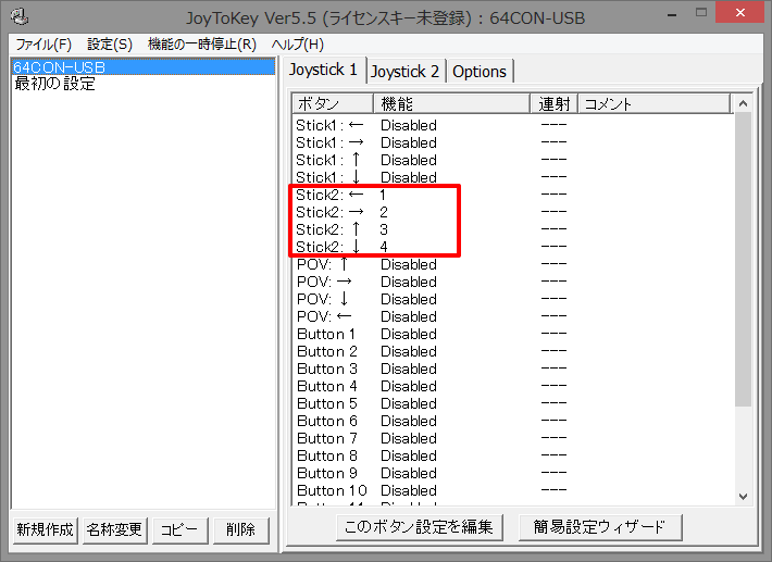 Stick2を選択後、ダブルクリックか、ウインドウ下の『このボタン設定を編集』で個別に定義できます。