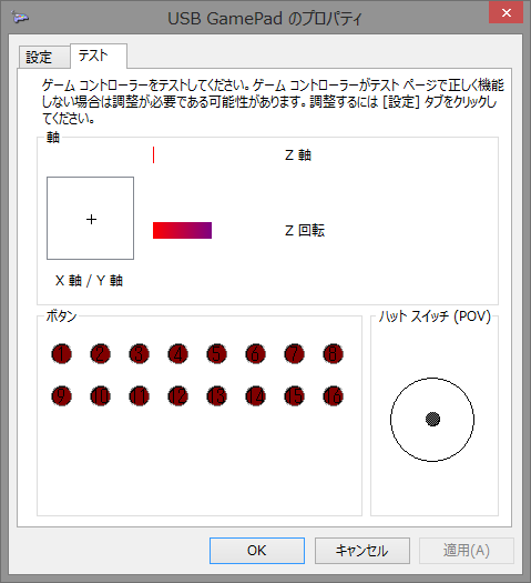 (※Z軸の割り当てはテスト画面で確認できませんが、『USB GamePadのプロパティ』の『設定』タブから行える『ゲームコントローラーの調整』で、数値データを表示させていると反応がある事が確認できます。もしくは、JoyToKeyの『設定』メニューから『ジョイスティックの調整・設定』を選択、『2.デバイスごとの詳細設定』で、Cボタン↑↓がZ軸(Z)である事が確認できます。)