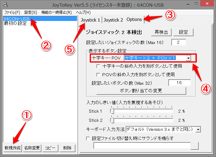 →⑤、コントローラーを繋いでいるポートの『Joystick』タブを選択。