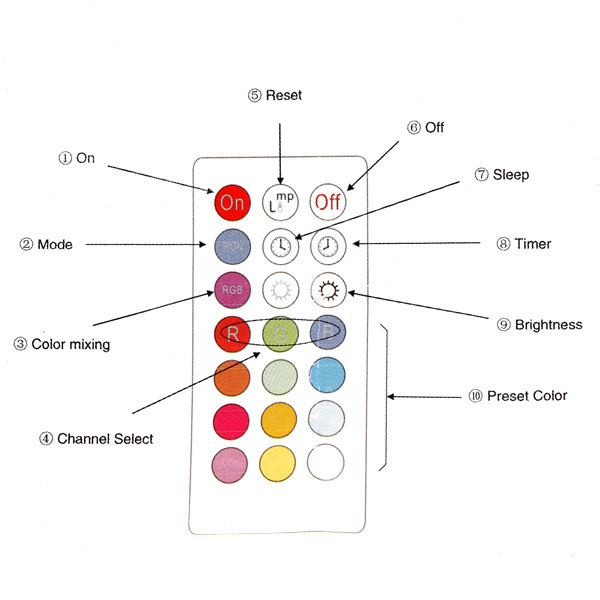 - ⑨のBrightnessボタン+④のR、G、Bボタンで調色