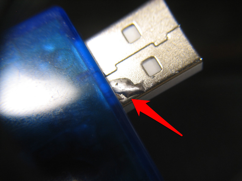 USB端子にこびりついたハンダは、USBポートにやや干渉して奥まで挿し込めない不具合につながっていたので、削って除去して解決です。