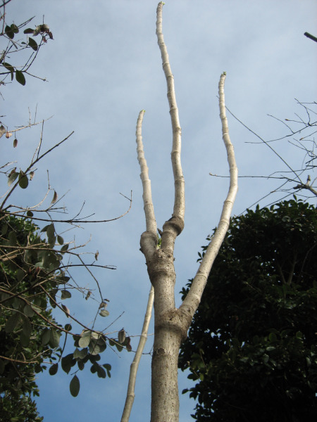 幹が三つ又に分かれていますが、三つ又の上の色が変わっている部分が去年成長した部分です。