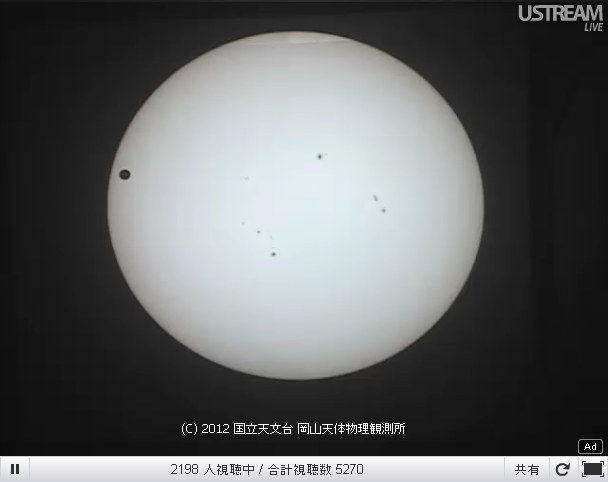 ネットだと天体ファンや、各地の観測所がニコ生、UStream、Twitterなどを使って観測様子を配信しており、世界各国でも、それぞれの観測所で観測様子が配信されていました。やはり、金環日食ほどの盛り上がりは無い感じでした。