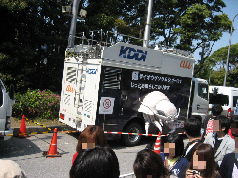 毎年、中に入る為の列に並んでいる途中で見れる各電波キャリアの基地局車ですが、超ダイオウグソクムシブースはauとコラボしていた為か、今回のauの基地局車のサイドには、大きなダイオウグソクムシのオブジェがくっついており、注目を集めていました。