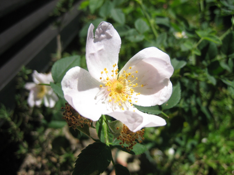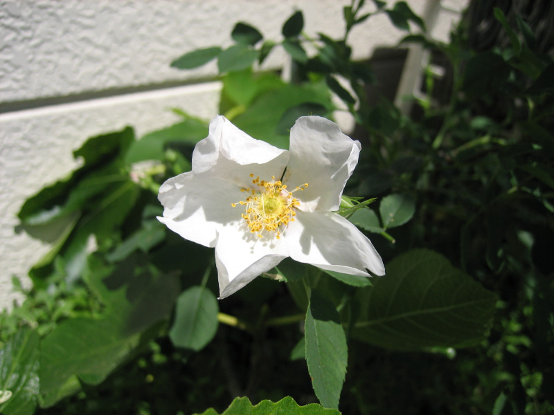 白い花を咲かせていたロサ・カニーナに、ほんのりピンク色な花が咲きました。