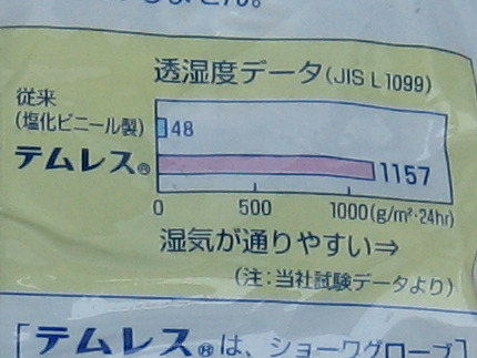 『テムレス』は「JIS L 1099」の透湿実験において、従来の塩化ビニール製手袋よりも、約21倍も湿度を通しやすい事が証明されているそうです。