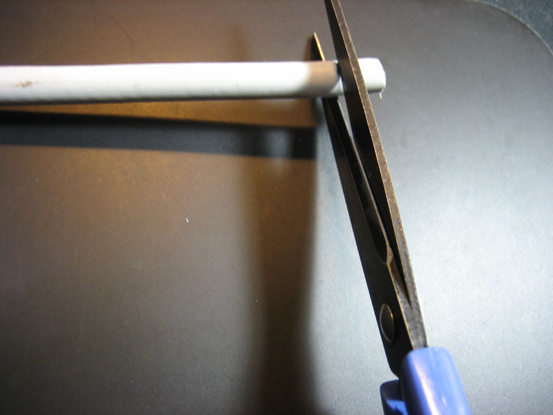 右:2、ケーブルを押さえながら、印をつけた所をハサミで軽く挟み、ハサミを一周させて輪っか状の跡がつくようにします。