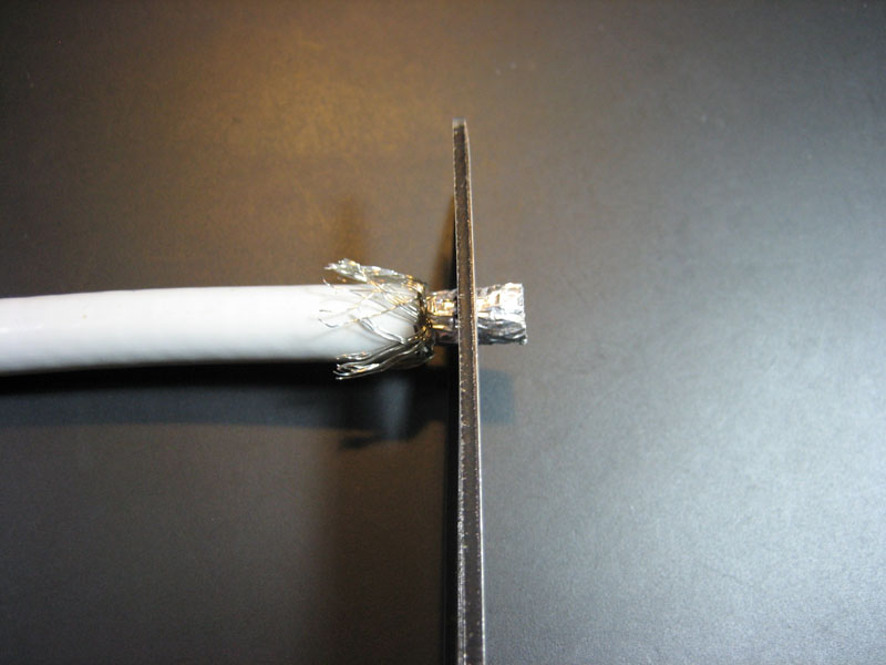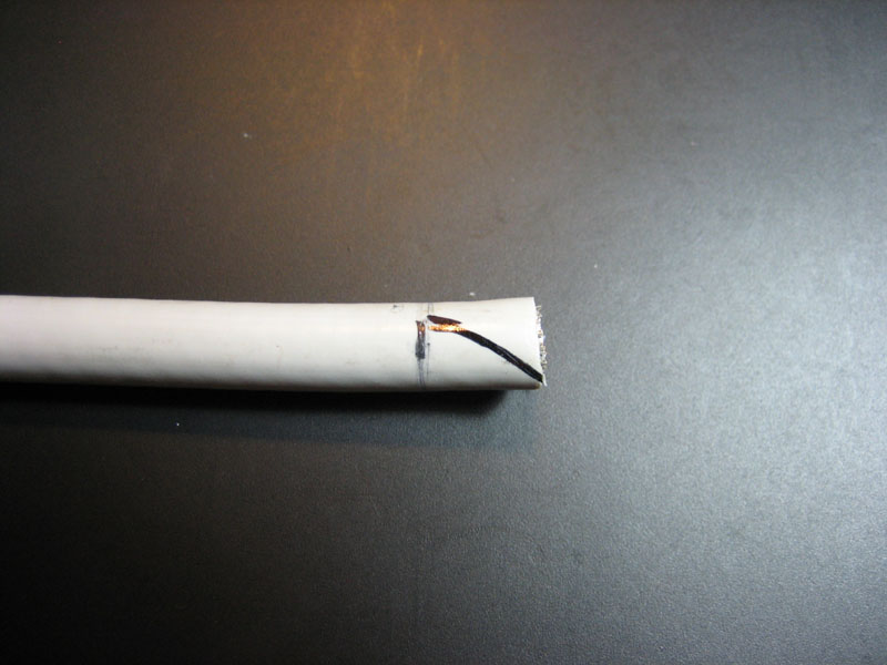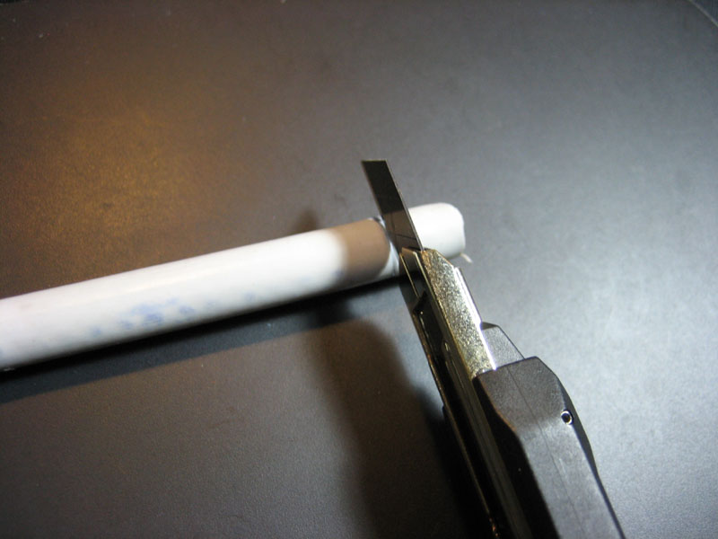 右:12、ハサミで付けたガイド線にそって、ちょっと深めにカッターで切れ込みをいれます。中の芯線を傷つけないようにしてください。