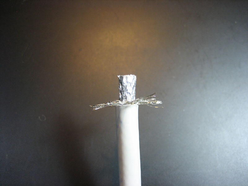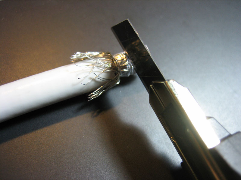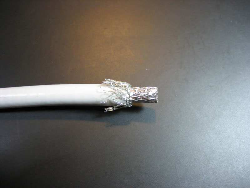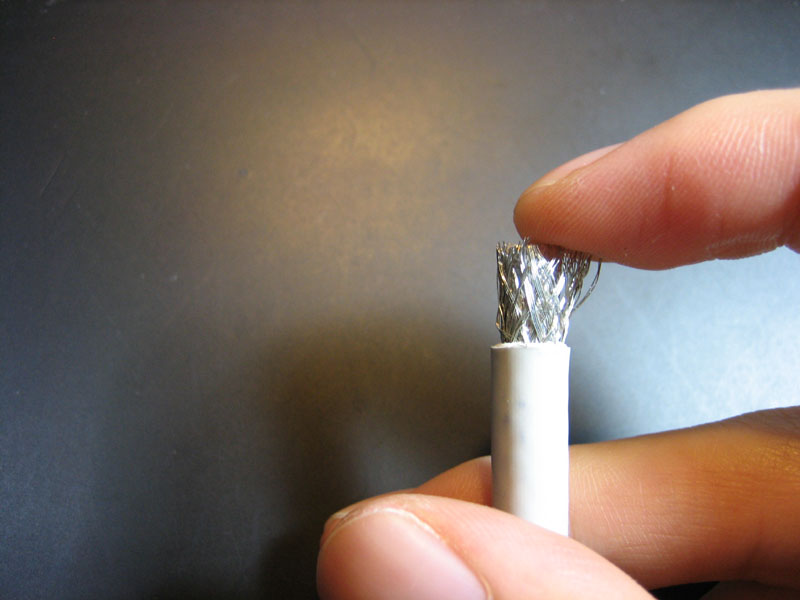 左:7、外被の被覆をはがすと、金属のあみあみ「編組線」が登場します。これを軽く指で中から外に弾いていきます。