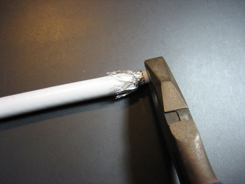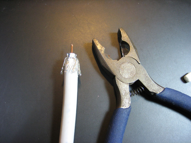 右:16、F型プラグに入りやすいように、ペンチのニッパー部分やニッパーで、先端を槍のように加工します。