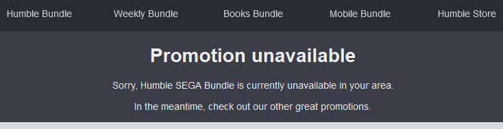 バンドルセール『Humble SEGA Bundle』が開催中ですが、SEGAによる日本を含むアジア一部地域の規制で、日本からは購入できません。(通称:おま国)
