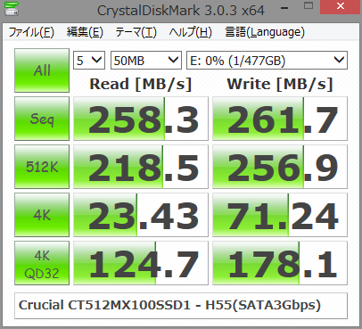 『CrystalDiskMark』ver3.0.3 x64版で、ベンチマークを取ってみました。