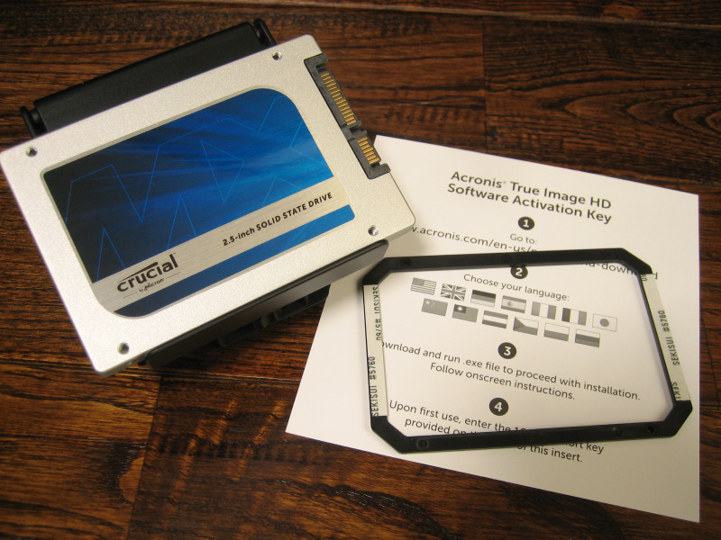 内容物は、静電気防止袋に入った『MX100』本体と、両面テープで貼り付けるタイプの樹脂製『9.5mm化アダプター』の他に、データ移行ツール『Acronis True Image HD』のキーが印刷された紙が付属しています。