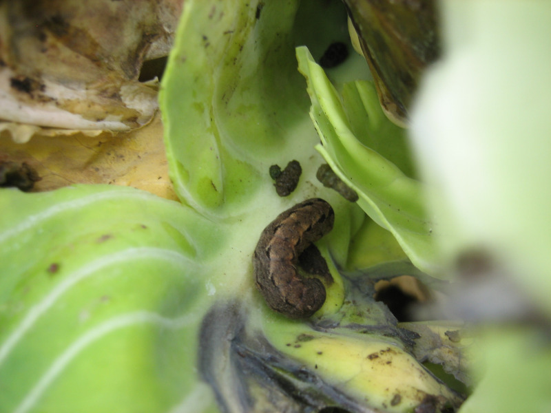 また、食べ物に困ってやってきたと思われるヨトウムシが葉っぱの間に居て、外葉が食べられている部分がありました。