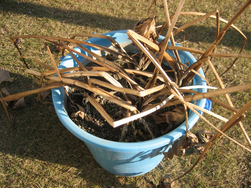 上の葉が枯れた後は水をあげず、雨よけができる所にバケツを置いて保管しました。