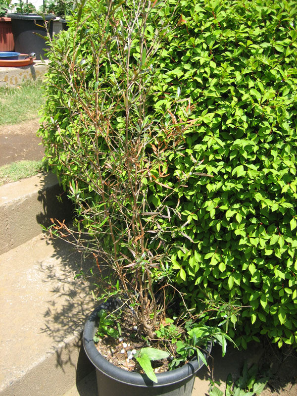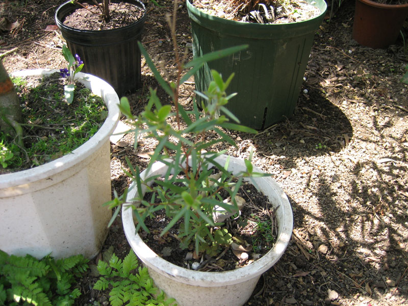 撮影する場所が悪くて、レモンティーツリーの葉っぱがどれだか判り難いですが、長細い葉っぱがティーツリーの葉っぱです。その葉っぱをこするとレモンのいい匂いがします。
