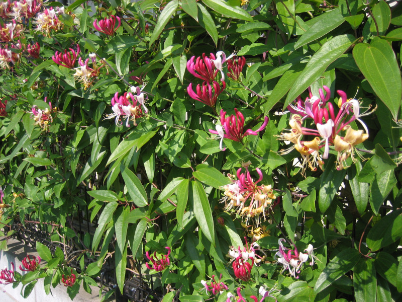 赤系のロニセラの中では特に花の色が濃く、緑とのコントラストが強い事で存在感があります。