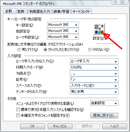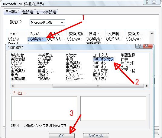 [ プロパティ ]→[ 全般 ]→[ 設定 ]→[ ひらがなキー ]の入力をダブルクリック→[ 機能選択 ]→[ IME-オン/オフ ]をダブルクリック→[ OK ]を押します。