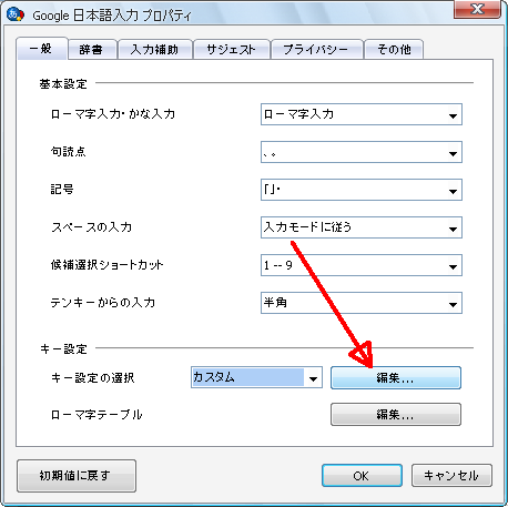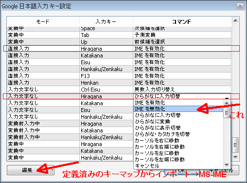 [ プロパティ ]→[ 一般 ]→[ キー設定 ]→[ キー設定の選択 ]→[ カスタム ]→[ 編集 ]→[ 編集 ]→定義済みのキーマップからインポート→[ MS-IME ]→「直接入力・Hiragana・IMEを有効化」の設定はもう既にあるので、「入力文字なし・Hiragana・ひらがなに入力切替」を変更して「入力文字なし・Hiragana・IMEを無効化」に変更→[ OK ]を押します。