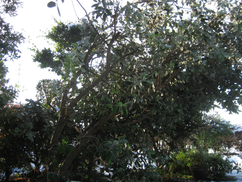 雪の重みで幹が曲がってしまった南米原産のフェイジョアです。
