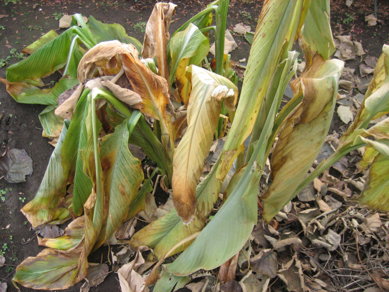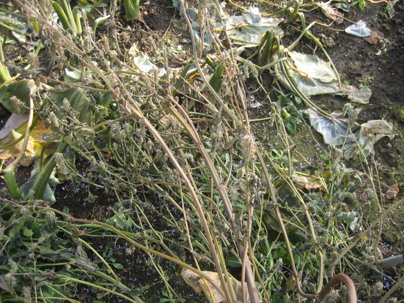 今年、9月の日照不足のせいか成長が悪いままだった里芋も、葉がぐったりです。