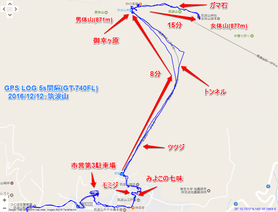 ケーブルカーのカーブ途中で表示が途切れてるのはトンネルがある為ですが、ポケットに入れたまま、この精度でログが取れたのでテスト結果は上々です。