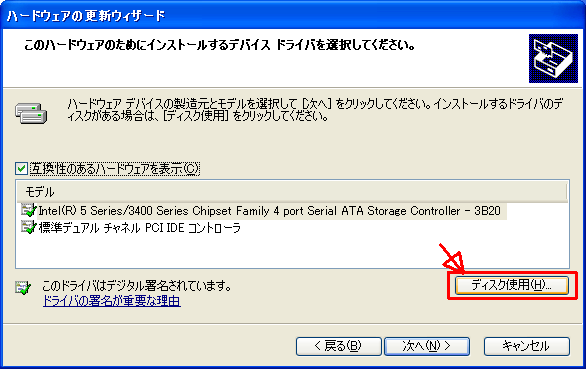 3、互換性のあるハードウェアが表示されますが、右下の「ディスク使用」を選択します。