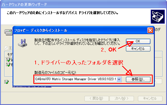 4、フロッピーディスクからインストールするというウインドウが出ますが、HDDやUSBメモリ、CDやDVDからもインストールできます。右下の「参照」から、「iaAHCI.inf」の入ったフォルダを選択して下さい。32bitドライバーは「f6flpy32」に入っています。64bitの場合は「f6flpy64」です。選択したら「OK」。