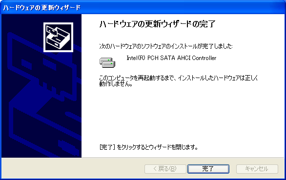 6、インストールが完了します。「完了」を押すと再起動を促されますが再起動しないで下さい。、そのままだと、IDEモードのドライバーが無くなってしまいます(?)。※私は間違えて再起動してしまい、どうやってもIDEモードで立ち上がらなくなってしまいました。