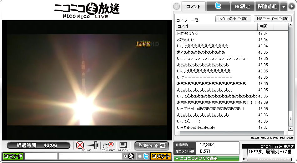 ニコ生ではロケット発射恒例の、見送りコメント弾幕が見られました。