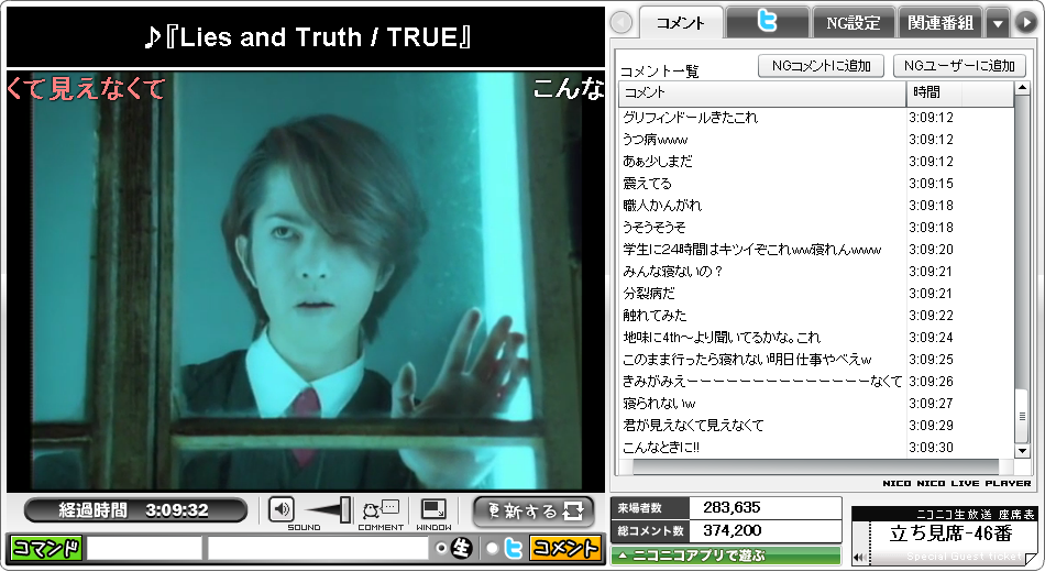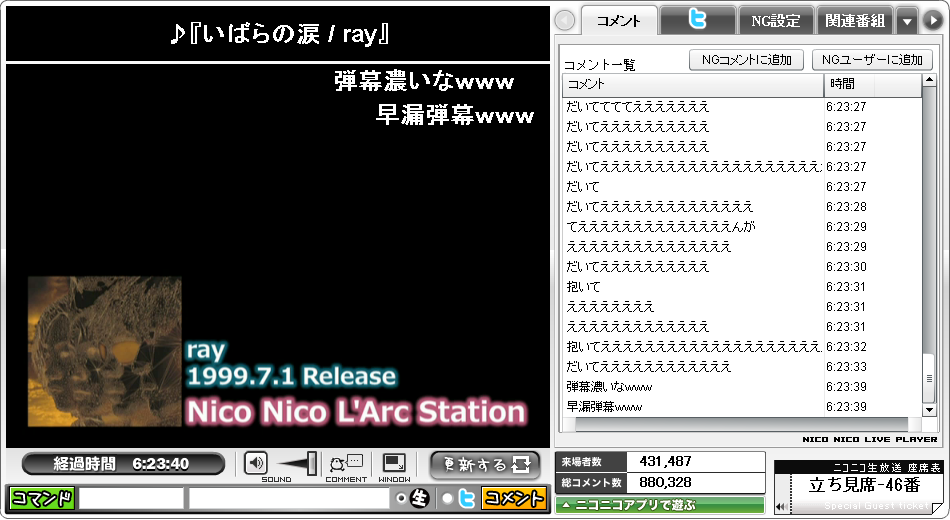 人気の曲はコメントも厚く、特徴的なフレーズがある時には弾幕が起きていました。放送状態はPVが有名だった曲はPV付きで放送、それ以外はジャケ写真と曲だけの黒画面といった感じでした。(上の写真参照)