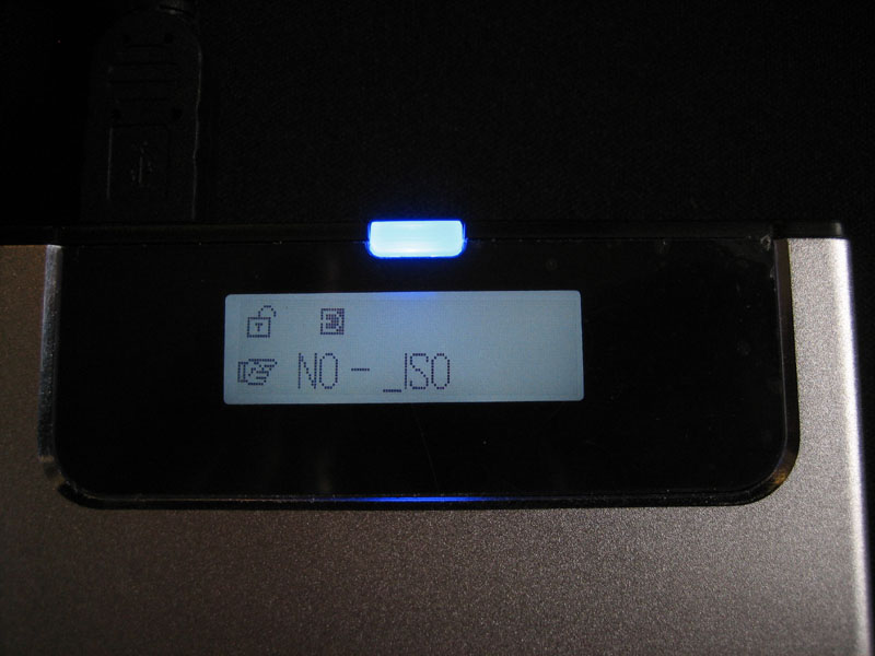 ISOイメージが何も入ってない状態で接続すると、NO-ISOと出ます。液晶の上の青いランプはアクセスランプです。輝度はそれなりで眩しいということはないです。(カメラの設定を調節しましたがLEDは上手く撮れませんね・・・。)対応HDDでは温度が表示されますが、古いモデルのHDDなので温度は表示されませんでした。