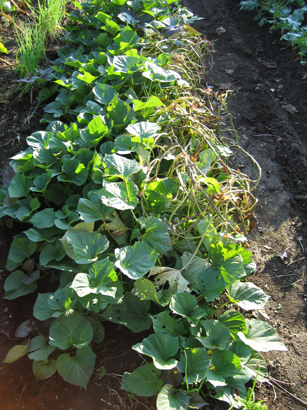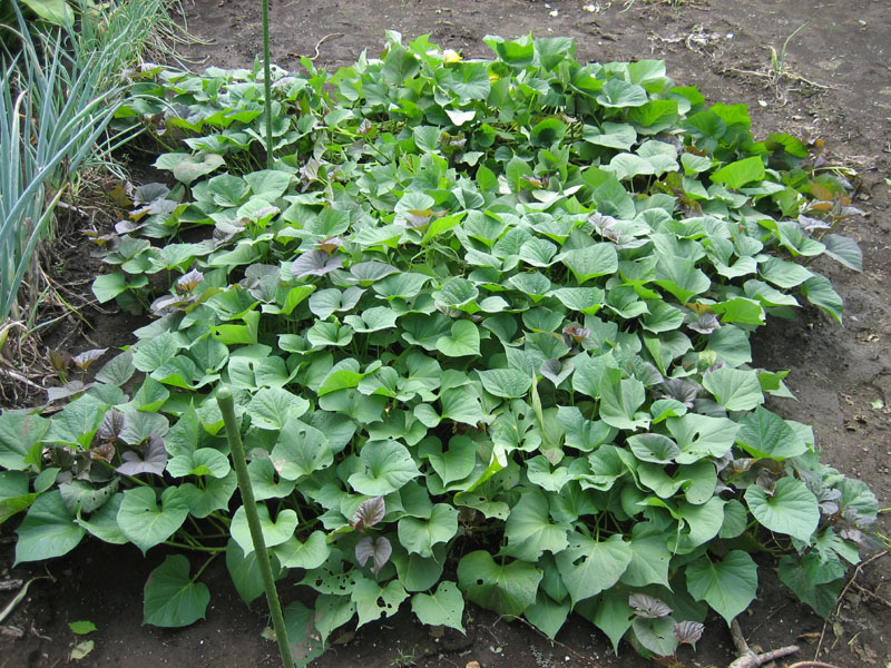 夏の日差しでかなり成長しました。痩せた土地のほうがよく育ち、芋が大きくなる植物なので肥料はあげませんでした。