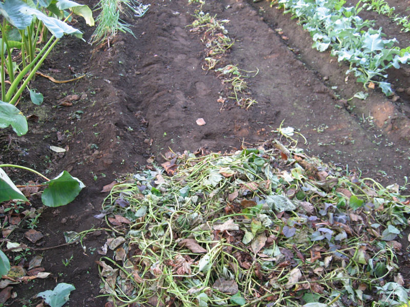 ただし、放置しておけば良いというものでは無く、このままだと、伸びたツルの下に根が出てきて新たな芋ができはじめてしまい、一つの芋が大きく育たなくなってしまうので、ツルをひっくり返す『ツル返し』をします。右の写真がツル返し後の様子です。