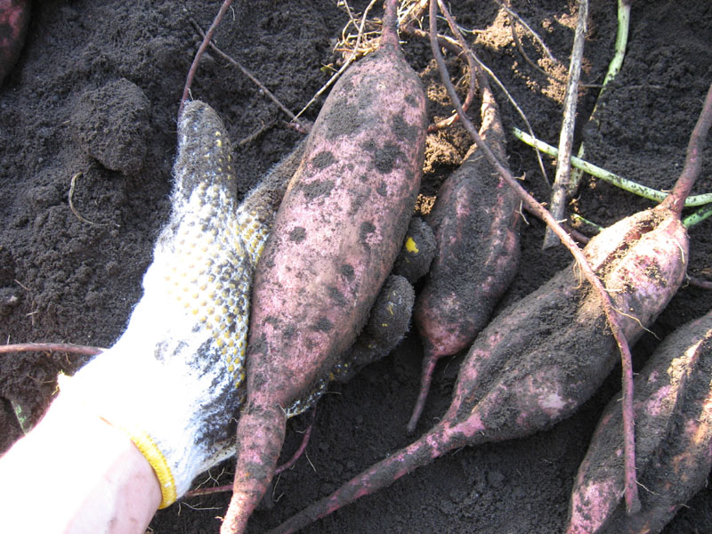 芋の大きさは芋ヅルの生育状態によって大きく差がでました。右の写真は一番大きい安納芋です。紅あずまなど一般的なサツマイモと比べて小さく感じますが、安納芋は小さめの芋なので、このサイズでまあまあの大きさです。