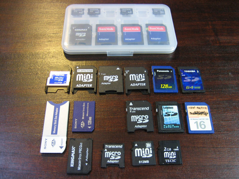 下のカードは今まで買ったカード類とアダプタです。他に、昔初めて買った32MB(9,980円)のSDカードがあったはずなのですが、みつかりませんでした。しかし、SDカードが出た頃と比べるとホント大容量で安くなりましたね。ちなみに、この中で使えなくなったカードは1つもありません。