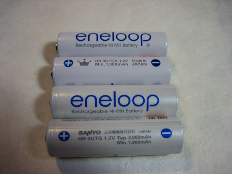 右の写真:上の二つが第2世代(型番HR-3UTGA)、下の二つが第1世代(HR-3UTG)です。第2世代は2011年04月製造、第1世代は電池の刻印をみたところ2005年10月製造のものでした。この二つの細かい違いとしては、+電極の高さをノギスで測ったところ第1世代で1.1mm、第2世代で1.6mmとなっており、+0.5mm程長くなっています。ただし、長くなったのは2006年モデルからなので、第1世代と第2世代の違いとは言い難い所です。また、+電極の付け根にあった小さい穴がなくなっていたり、-電極の表面加工が細かい凸凹状になっている点も変更点となっています。