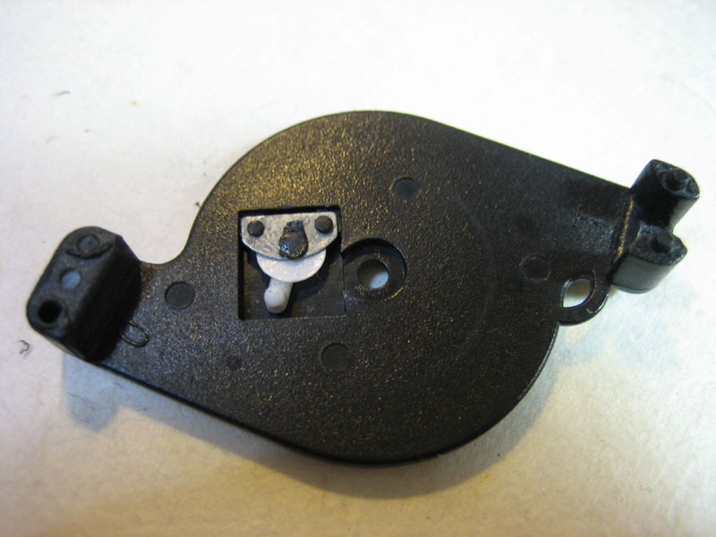フタに見える白い突起(ラッチ)が重要です。この突起を、ゼンマイが閉まってある容器部分の溝に上手くハマるようにセットしてやります。重要というのは、このラッチ部分が対面の溝を移動する事でケーブルを止める構造になっている為です。