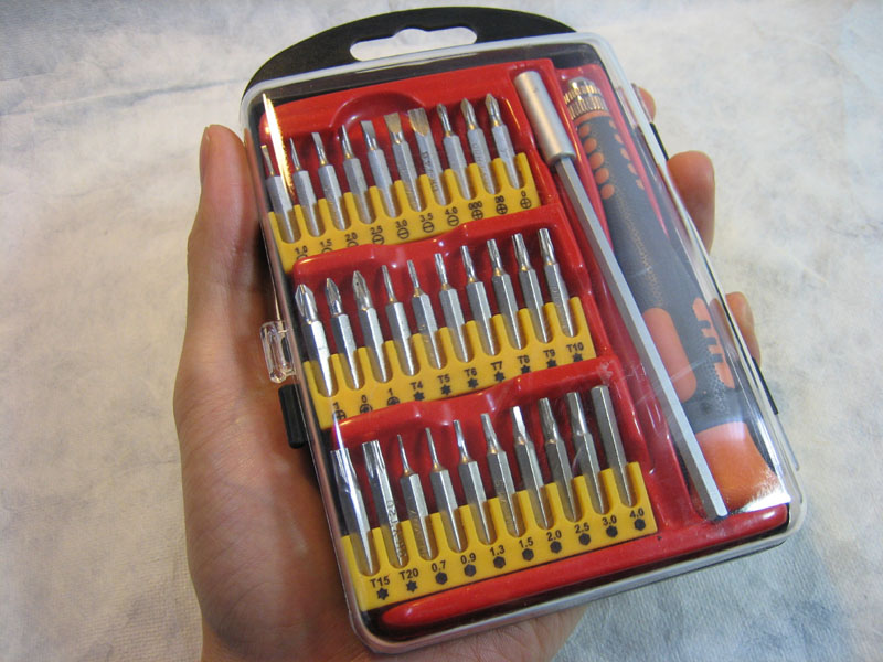 開けてみて気付いたのですが、想像してたよりも小さいドライバーセットでした。裏のラベルには(32pcs Mini Screwdriver set)の文字があったので、元々Miniな製品として売っているようです。販売ページには何処にも書いて無いのですけね・・・。製造はMAID IN TAIWAN、台湾製です。原材料表記はありませんが、製品ページによるとスチールとABSのようです。