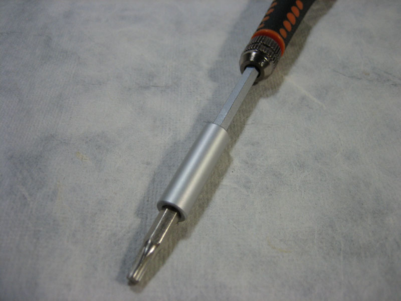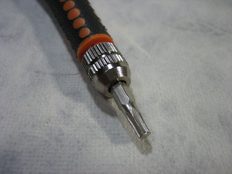 左の写真:ビットは付属のドライバーハンドルに装着し、ネジで固定してから使用する事になりますが、よく市販のドライバーにあるような、装着するだけで固定する方式と比べると、ビットを装着してからネジで固定するのは少し手間です。
