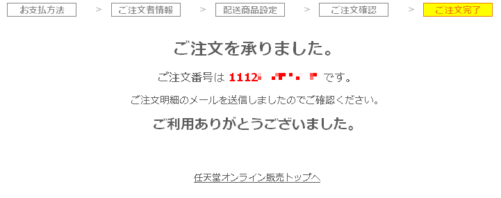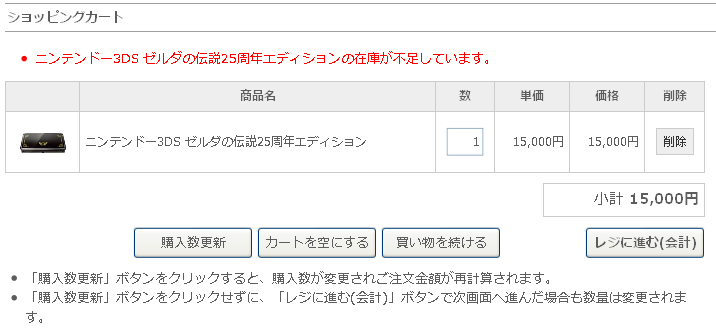 続々と来たという情報が書きこまれ、慌ててオンライン販売ページを更新すると、限定3DSが登場。焦りつつ、カートに入れてクレジットカードで購入を確定しました。また、注意として「※ご注文は、お1人様1台限りでお願いします。」と書いてあります。