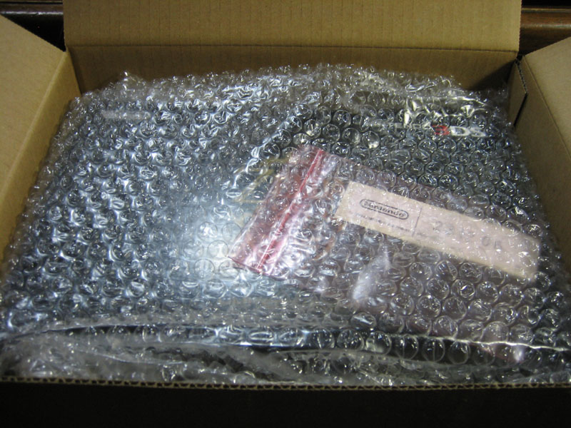 箱はテープでがっちり梱包、開けるとエアパッキン(プチプチ)に包まれた3DSが現れました。小袋に封入されたラベルは、保証書用の購入日付ラベルです。