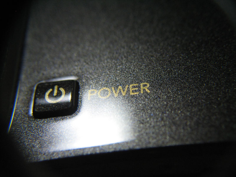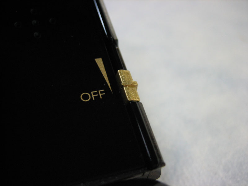 上の写真は中のPOWERスイッチの部分です。白くなっているのは反射した光ですが、その反射した光がPOWERという印刷に歪められる事無く写っています。つまり、印刷による凹凸よりも厚くコーティングされているということになります。