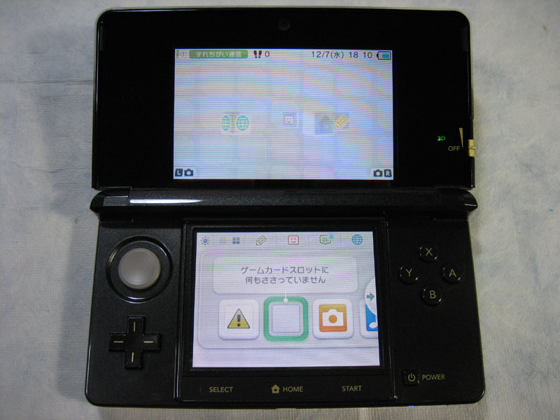 最後は動作確認です。何でもこの限定版には尿液晶と揶揄される、液晶がかなり黄色く見える個体が多数紛れているそうで、2ちゃんねるやTwitterでは報告が上がっています。うちの限定版は・・・ご覧のとおり恐らくは正常だと思いますが、比較対象が無いので実際は少し黄色味がかっているのかもしれません。例え若干黄ばんでいたとしても自分的には問題ないのでこのまま使い続けるつもりですが、あまりにも酷い場合の方は任天堂に一度送る事で調査?してもらえるそうです。ただし、仕様の基準内の場合はそのまま戻ってくるらしいですが・・・。
