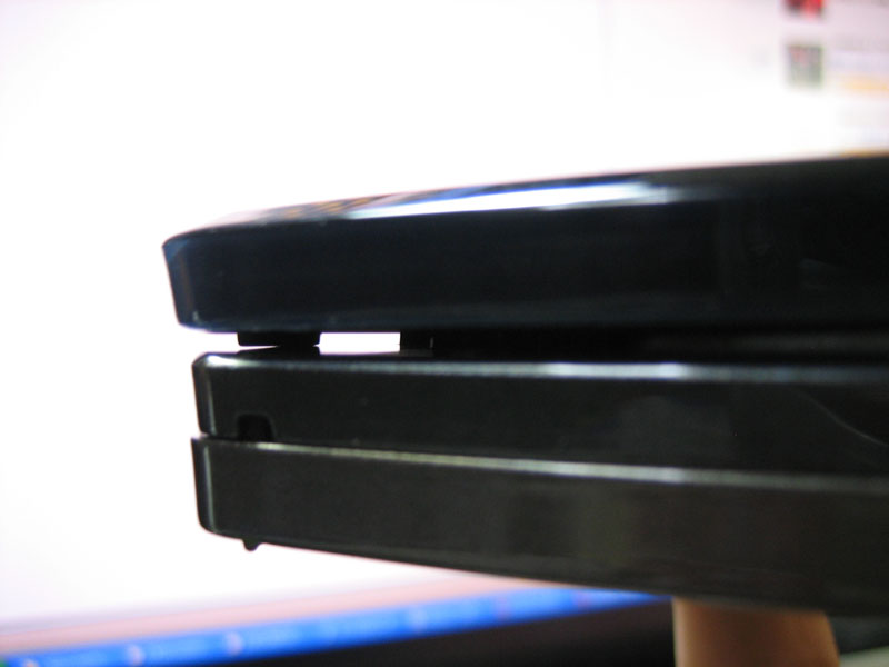 左の写真で出っ張っている部分が上面液晶のゴムクッションですが、このゴムクッション、まるで機能を果たしていません・・・。右の写真を見ると判りますが、下面と設置していなければいけないゴムクッションが、半分以上浮いています。これにより閉めた時に、「ガチっと」嫌な音でしまります。どうやら、下のHOMEメニューの枠に、上の液晶がぶつかっている音のようです。