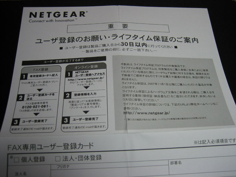 購入後30日以内にFAXかネットでユーザー登録すると保証がうけられるようになります。