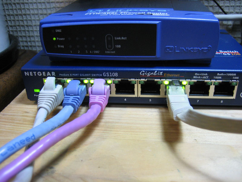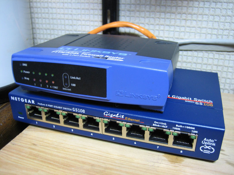 上に乗っているのは今まで6年間位使っていたスイッチングハブ付きルータ、LINKSYS(リンクシス)のBEFR41Cです。