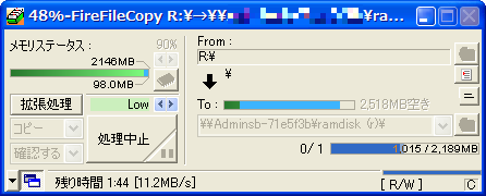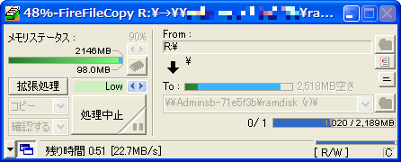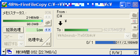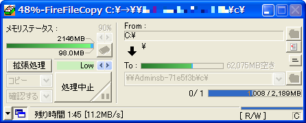 FirefileCopyはRAMキャッシュをHDDの一時領域として使い処理するので、高速にコピーや移動処理をすることができるソフトです。