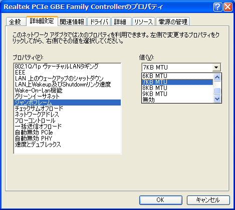 Jumbo Frameの設定は、デバイスマネージャーからネットワークアダプタを選択し、使っているLANアダプタを右クリックしてコンテキストメニューからプロパティを出し、詳細設定で設定します。(※WindowsXPの場合です)